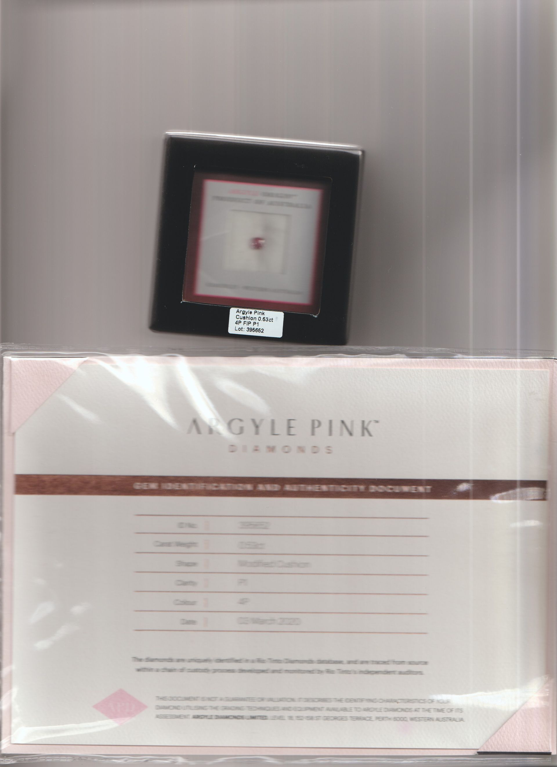This exceptional cushion-cut Argyle diamond, bearing Argyle ID 395652, is a captivating example of nature’s rarest artistry. Displaying a Fancy Intense Pink colour, graded 4P on the Argyle scale, it exhibits a beautifully concentrated and vibrant pink hue — a tone highly sought after by collectors and investors alike.