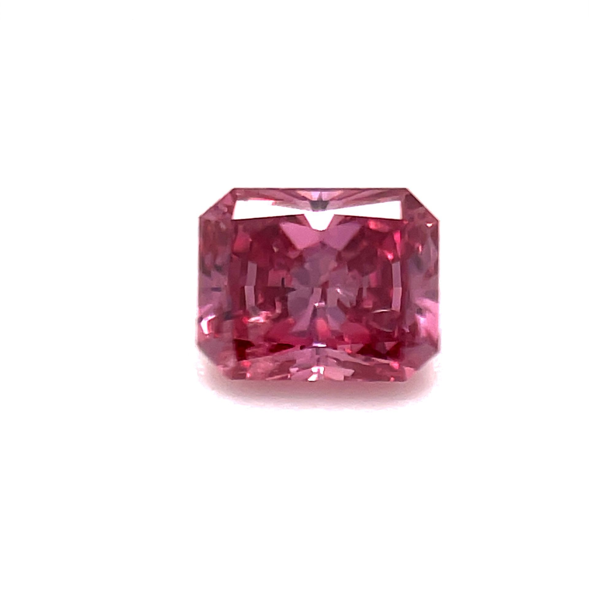 This striking radiant-cut diamond, certified under GIA Report 2195408817, showcases a captivating Fancy Intense Pink colour—one of the most sought-after hues in the world of natural diamonds.